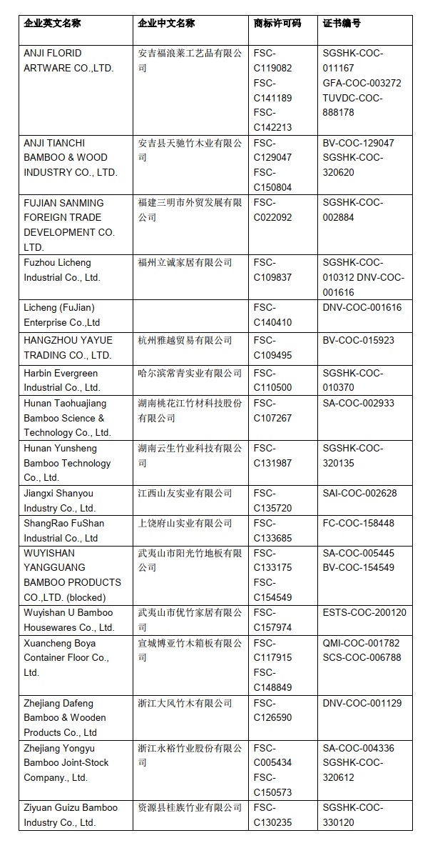 在2020年的一次检查中,FSC发现在竹制品交易验证中部分存在虚假声明的企业在证书被终止后,在未采取整改措施的情况下重新获得了新证书。考虑到其中的诚信风险,FSC已终止这些企业的商标许可协议,并禁止其签署新的协议。商标许可协议是持有有效FSC证书的前提,这也意味着这些企业的认证已终止,并被禁止重新获得认证。